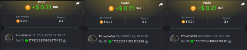 9x 0.32 https://bc.game/#/sd/11EBVJLUGH5GCZ Bet ID:327907009154254740 ----- 12x 0.32$ https://bc.game/#/sd/11EBVNY5LHXTGN Bet ID:327907009154254739 -- 15.5x https://bc.game/#/sd/11EBNUJIV3VEXZ Bet ID: 327907009154252993 ---- 16.5x 0.32$ https://bc.game/#/sd/11EBVQRMJB3NRN Bet ID:327907009154254742 -